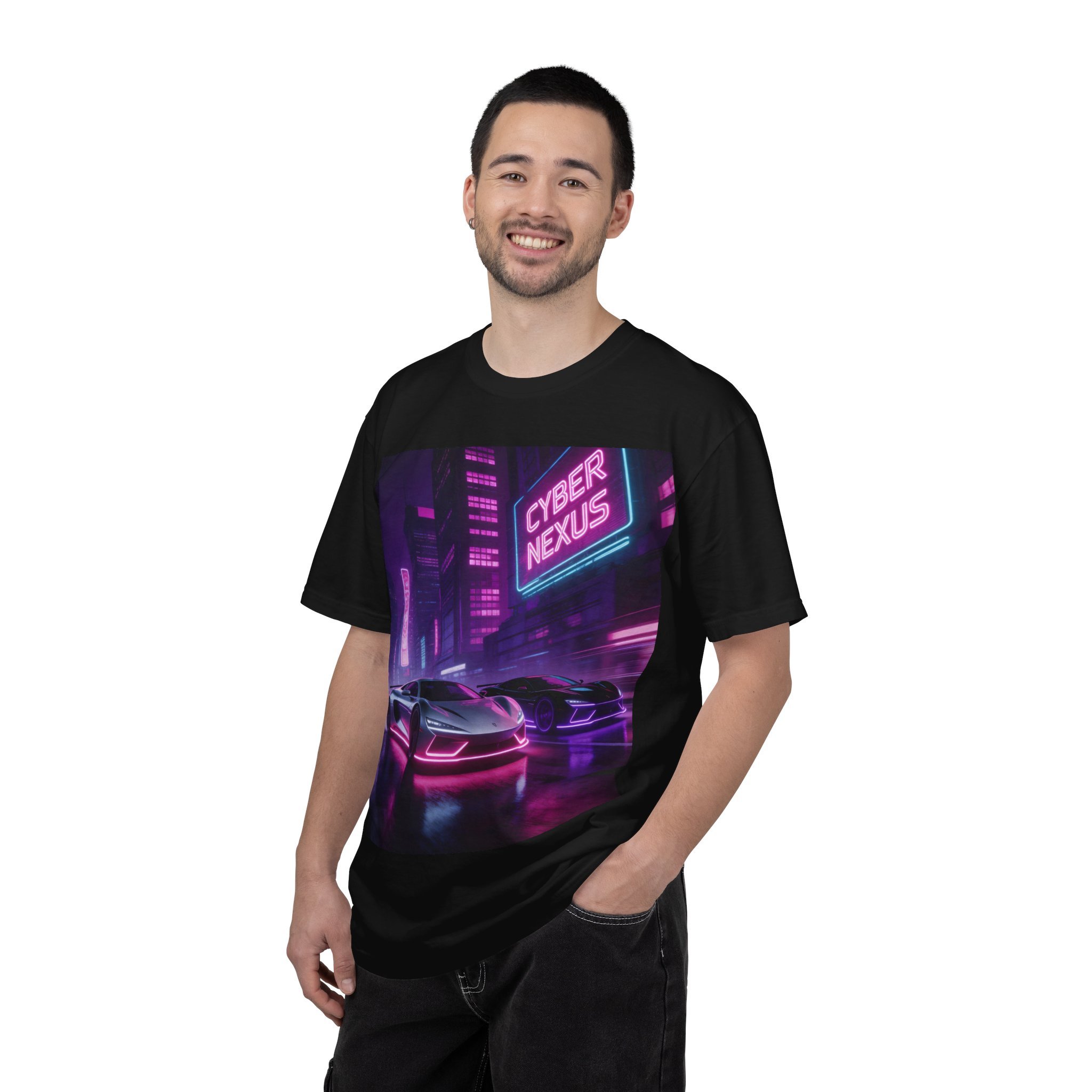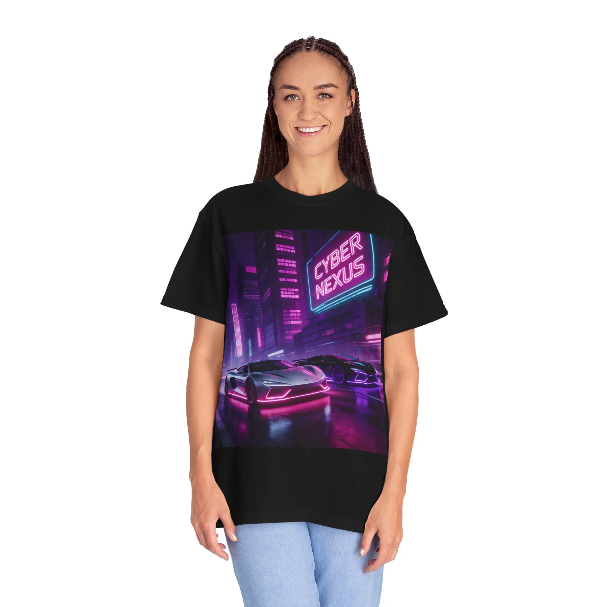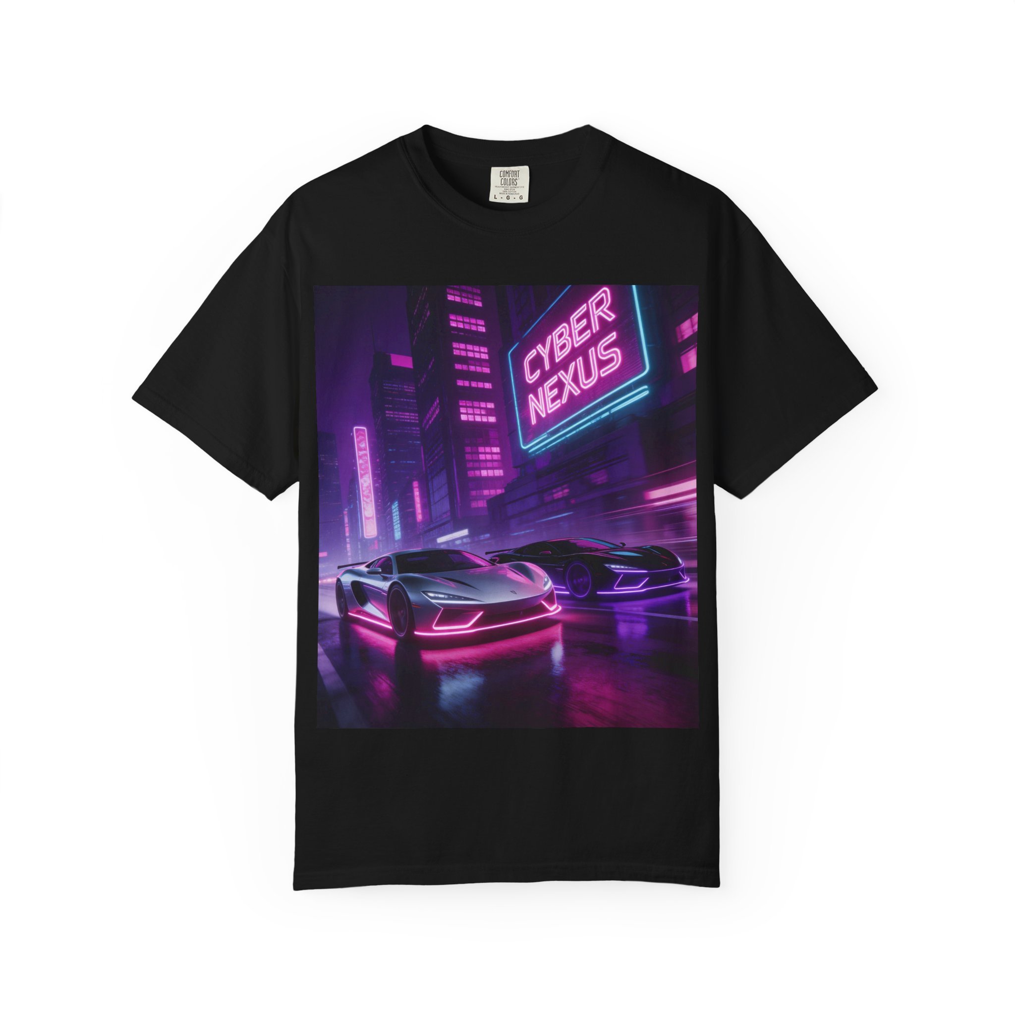 Slip into a shirt that feels like neon rain on asphalt. This heavyweight garment-dyed tee carries a cyberpunk night: low-slung sports cars, glowing signs, and slick reflections rendered in hot magenta and electric blue. The relaxed fit and soft, broken-in dye make it feel worn-in from the first wear — the kind of piece you put on before a late-night drive or a convention run. It settles into your routine: paired with black denim for city prowls, layered under a leather jacket at meetups, or worn while building playlists and sketching concept art. This is for people who chase mood and atmosphere — gamers, synthwave fans, and anyone who lives for neon-lit streets and cinematic nights.