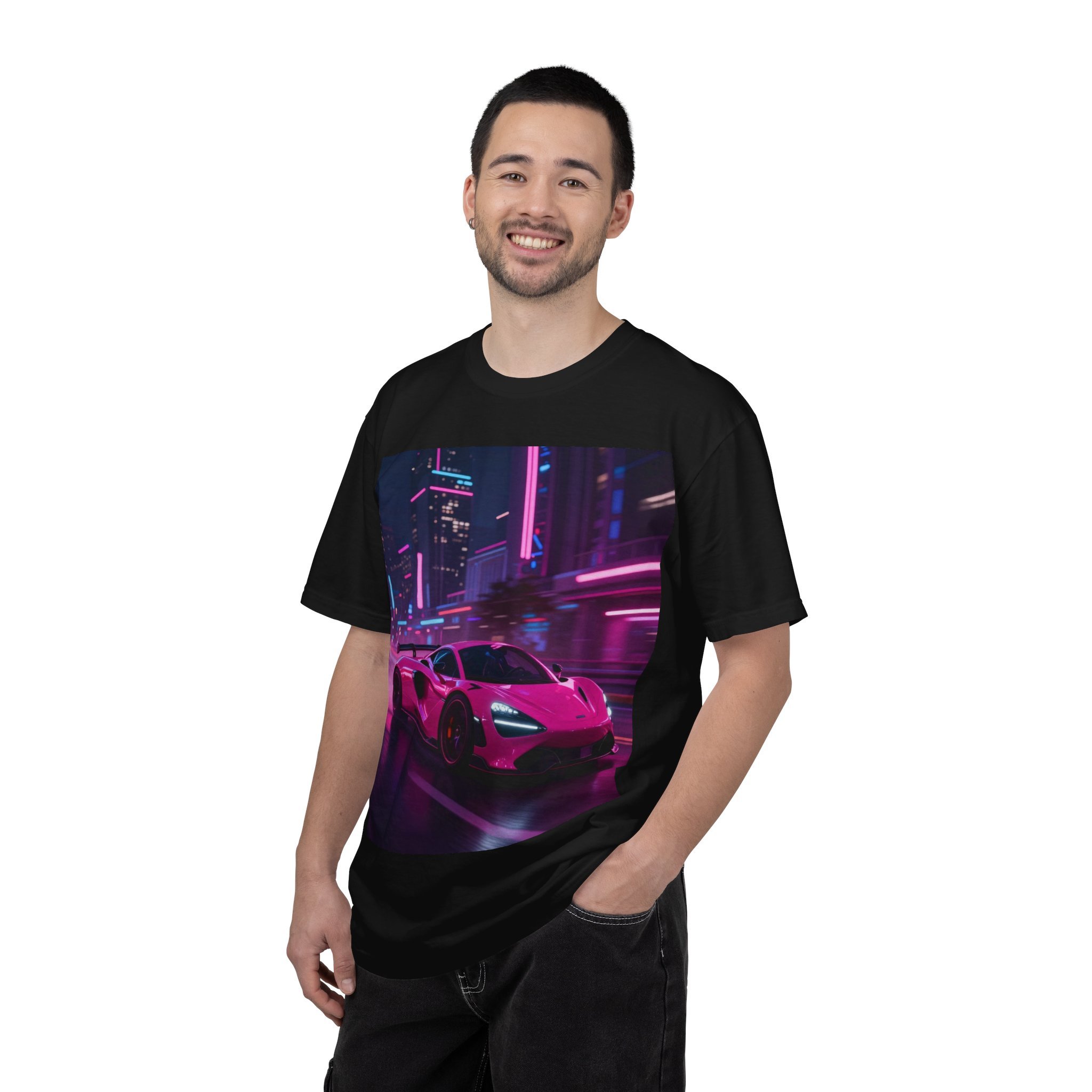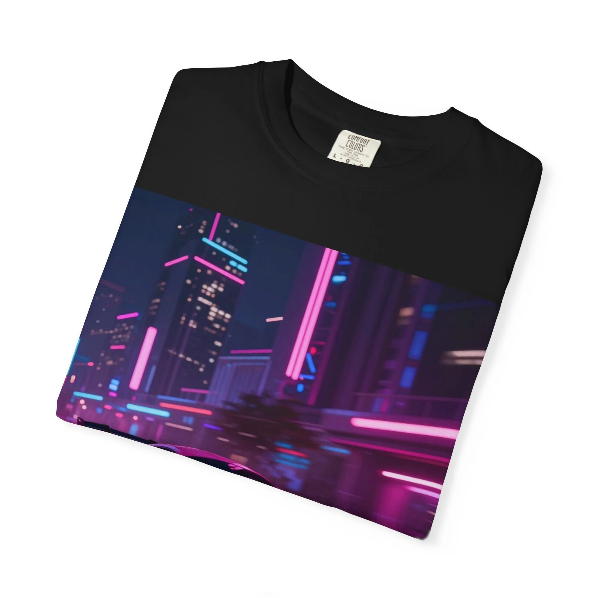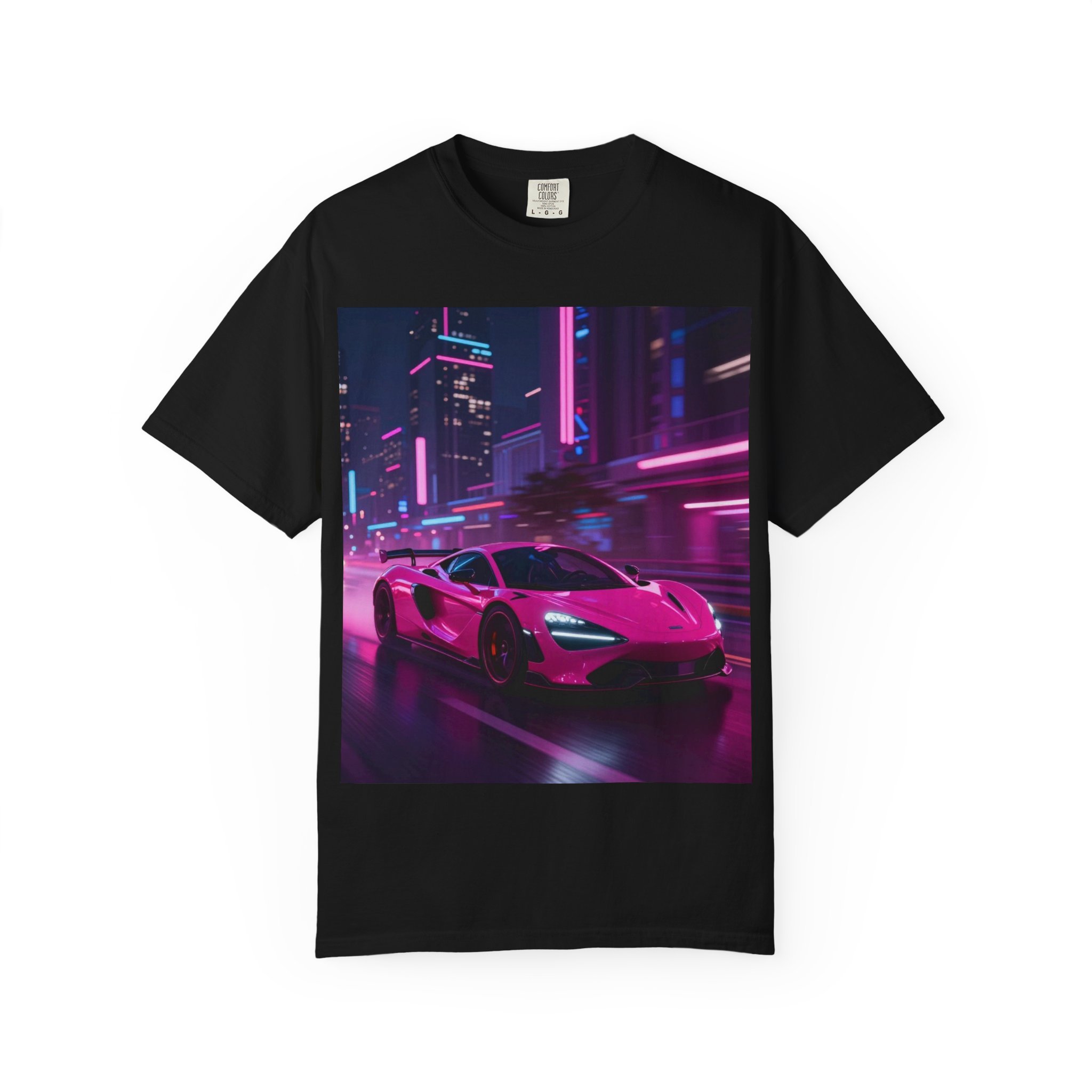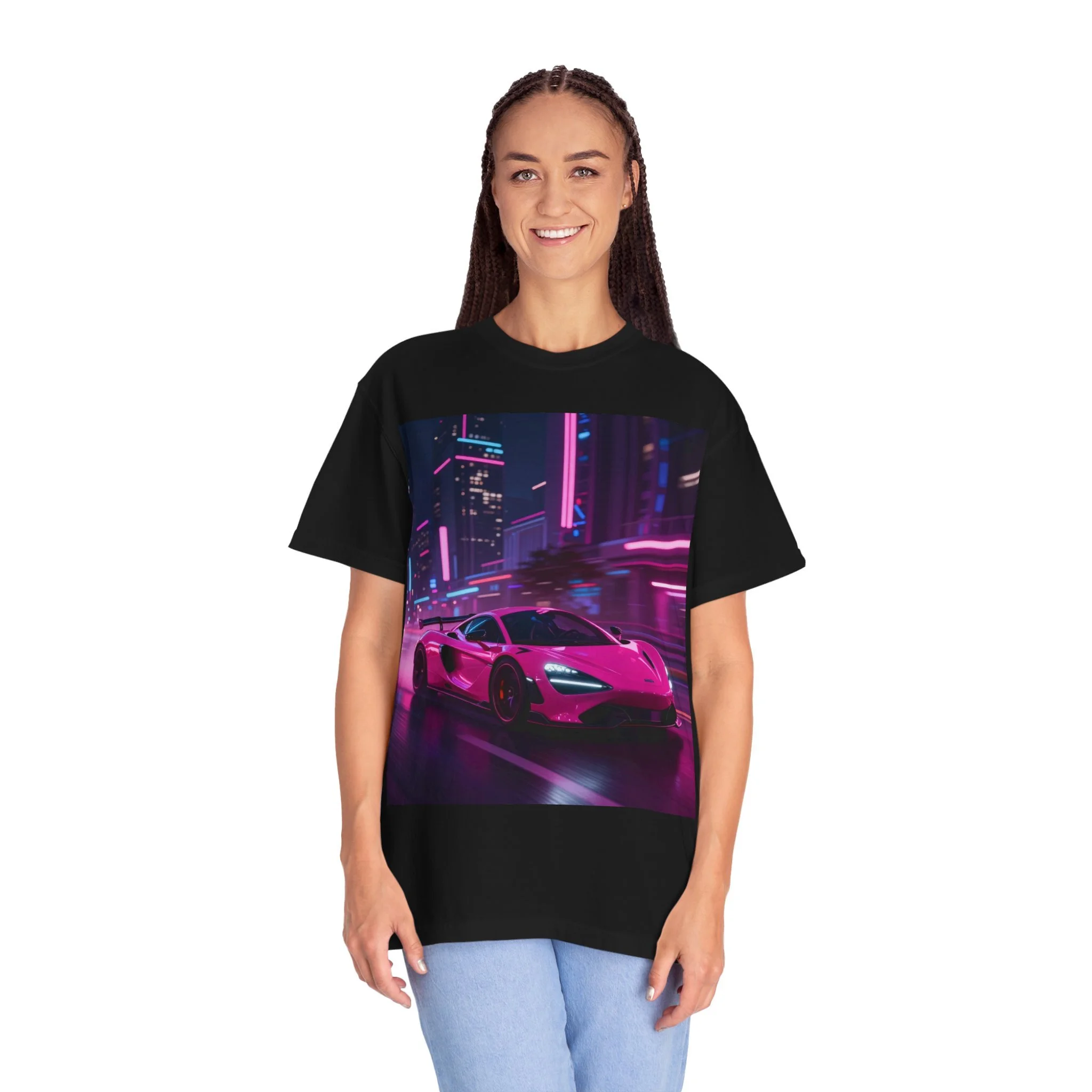 This heavyweight garment-dyed tee brings neon-soaked city nights to your everyday wardrobe. The front features a glossy, cyberpunk-inspired sports car streaking through rain-slick streets, rendered in vivid magenta and electric blue. The dyed, soft-hand cotton and relaxed cut create a lived-in feel from the first wear — like the shirt has already seen a thousand late-night drives. Wear it layered under a denim jacket or loose over joggers; it anchors casual looks with a confident, urban edge that fits right into nocturnal street culture and car-enthusiast meetups.