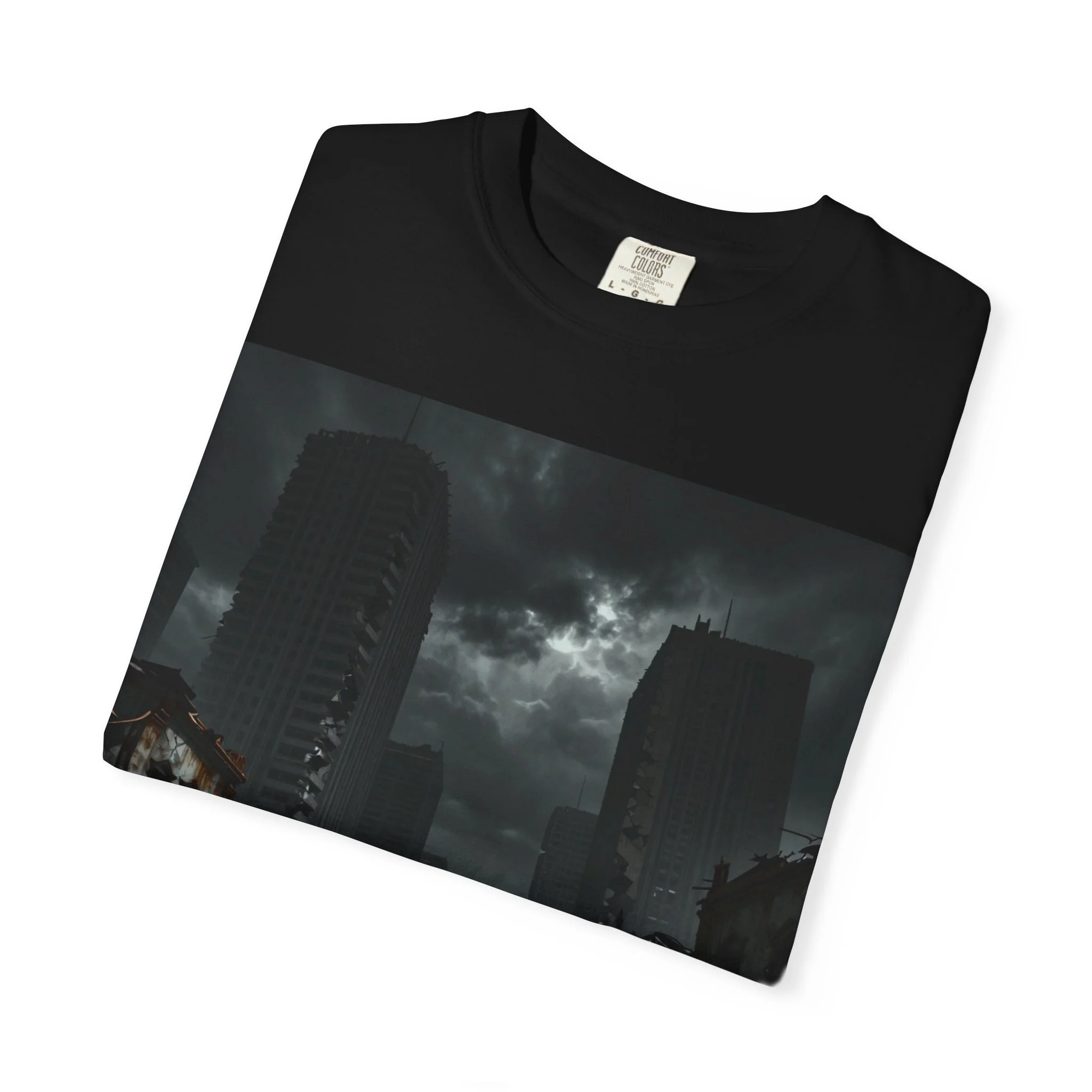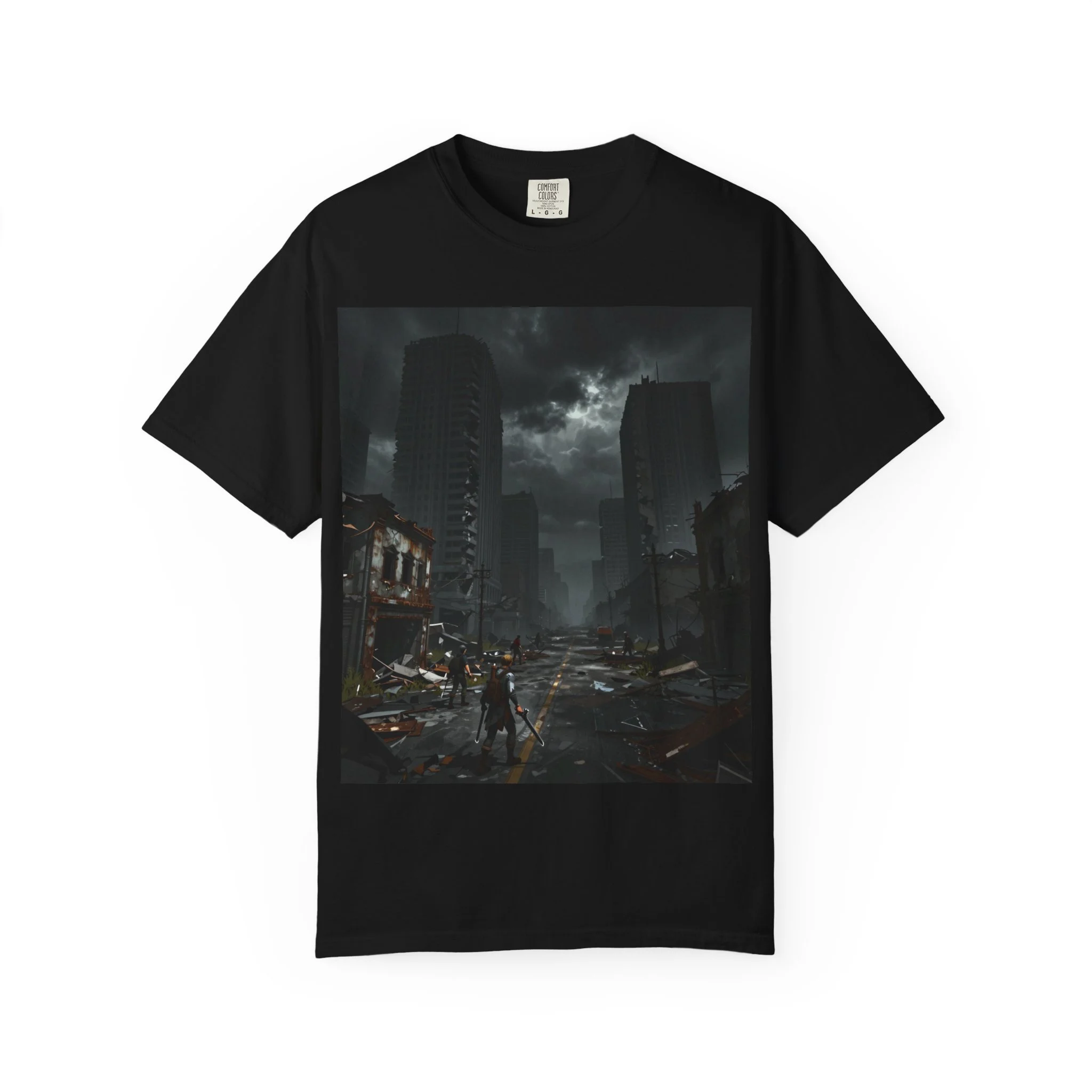 This heavyweight garment-dyed tee carries a cinematic post-apocalyptic cityscape across the chest — brooding skies, crumbling towers, and lone figures navigating empty streets. The soft, broken-in color from garment dyeing gives the print a lived-in, matte finish that blends into the relaxed silhouette. Wear it when you want an urban, atmospheric look that feels like a snapshot from a dystopian story. It layers easily under jackets, pairs with worn denim, and sits comfortably through long days thanks to sturdy construction and a roomy cut.