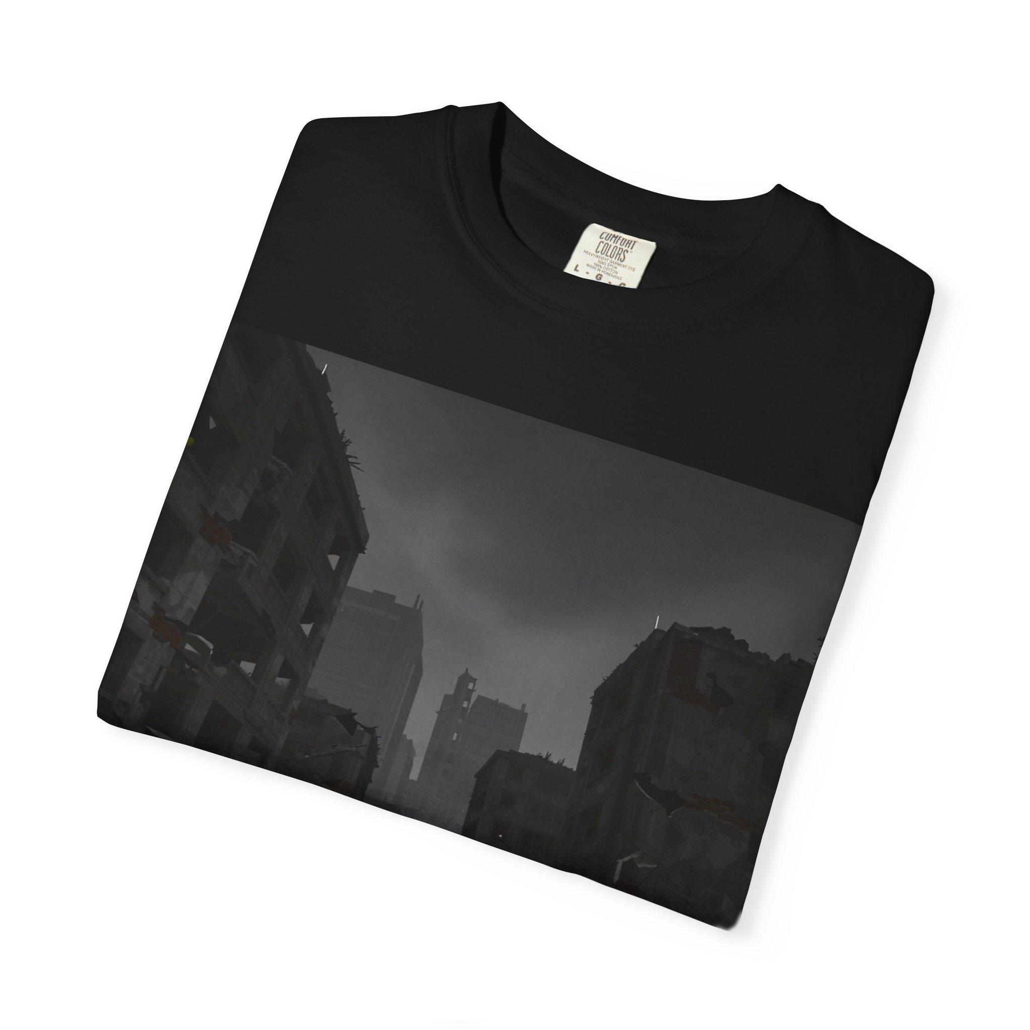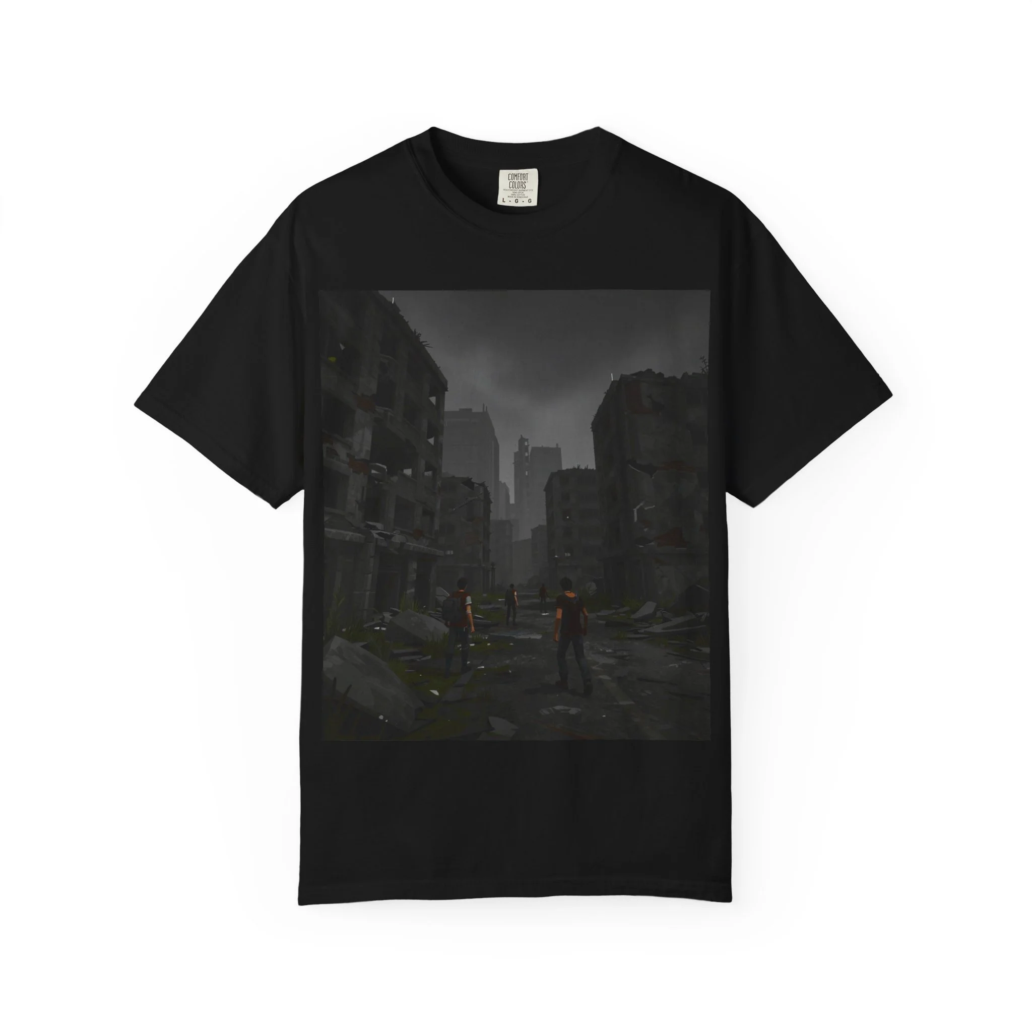 This garment-dyed tee carries a quiet, cinematic mood — a stretched-frame print of a ruined cityscape with lone figures moving through cracked streets. The heavyweight cotton has a lived-in softness from post-construction dyeing, so the image sits naturally on the fabric rather than looking new and loud. Wear it on cooler evenings while wandering urban ruins at dusk, at casual meet-ups with fellow gamers or storytellers, or layered under a jacket for a low-key convention look. The relaxed fit and muted tones let the artwork do the talking: atmospheric, slightly brooding, and made to be worn often.