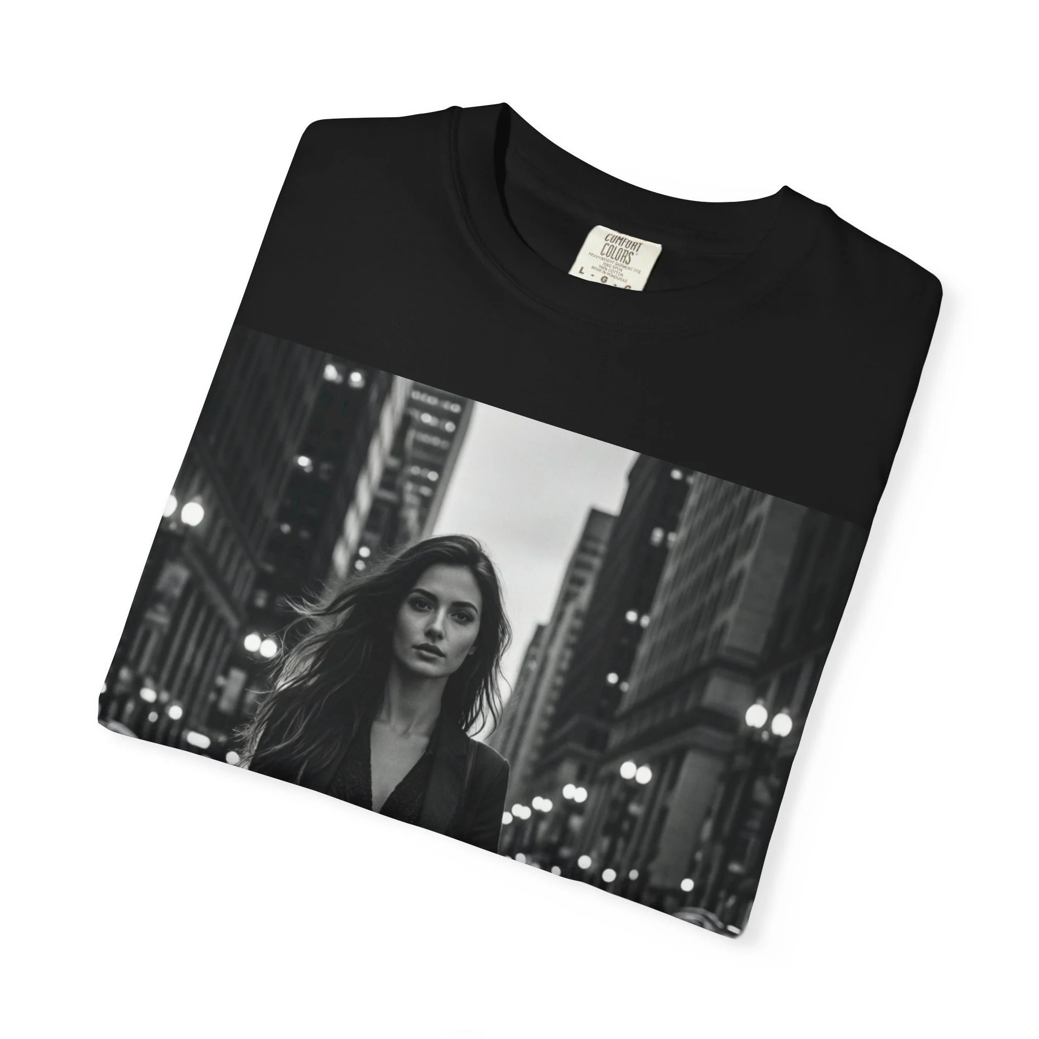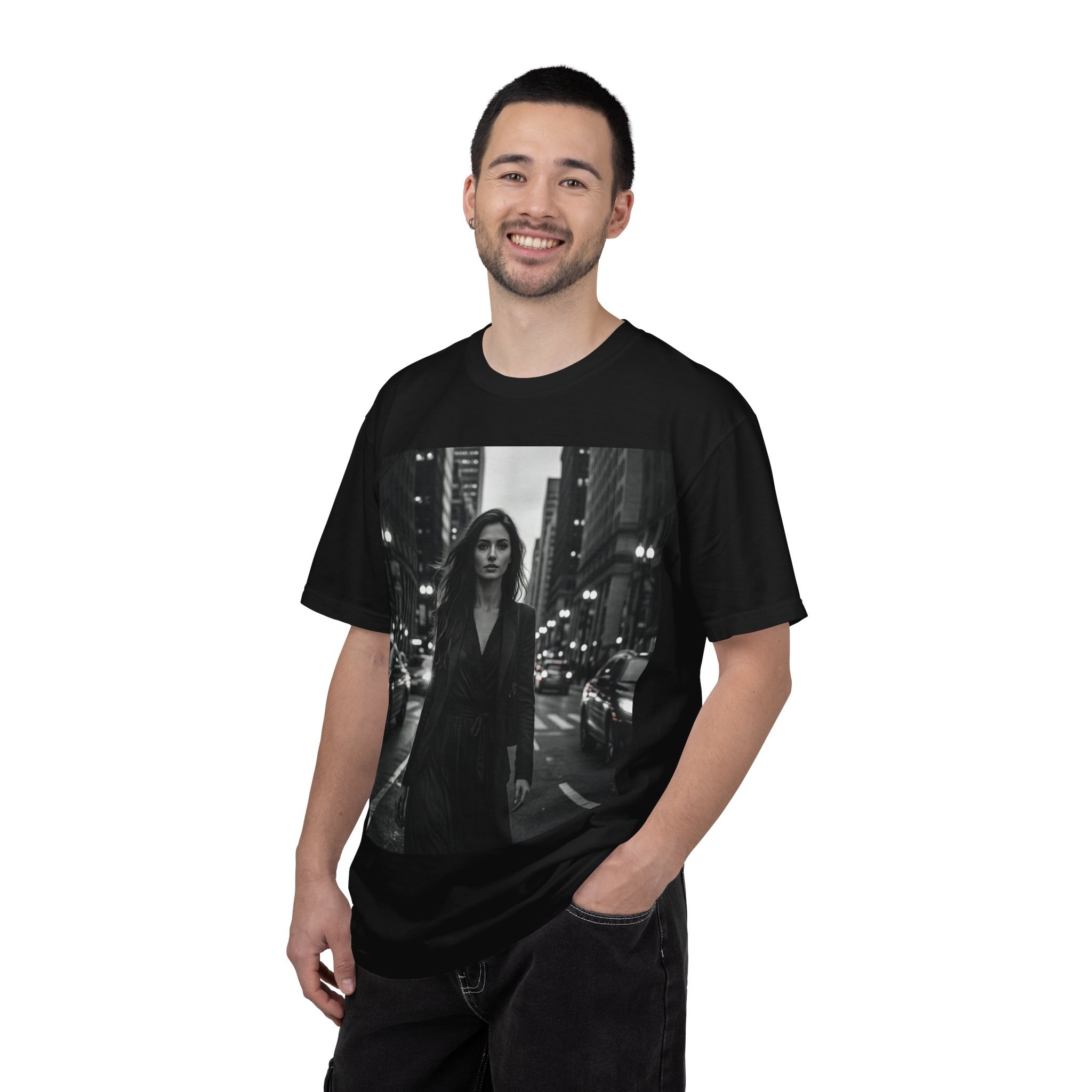 A heavyweight, garment-dyed tee that wears in like an old favorite. The shirt’s soft, lived-in color and relaxed fit put focus on the bold black-and-white street-photo print — a lone figure walking through a city at night, headlights haloing the scene. It tucks easily under a leather jacket, layers with an oversized coat, or stands alone with jeans for an effortlessly moody look. The dense cotton and double-needle stitching mean this shirt holds shape and texture through repeated washes, while the tubular knit and sewn-in label keep the silhouette clean. Available in a wide range of colors and sizes, it’s a go-to for anyone who loves cinematic, urban style and garments that age beautifully.