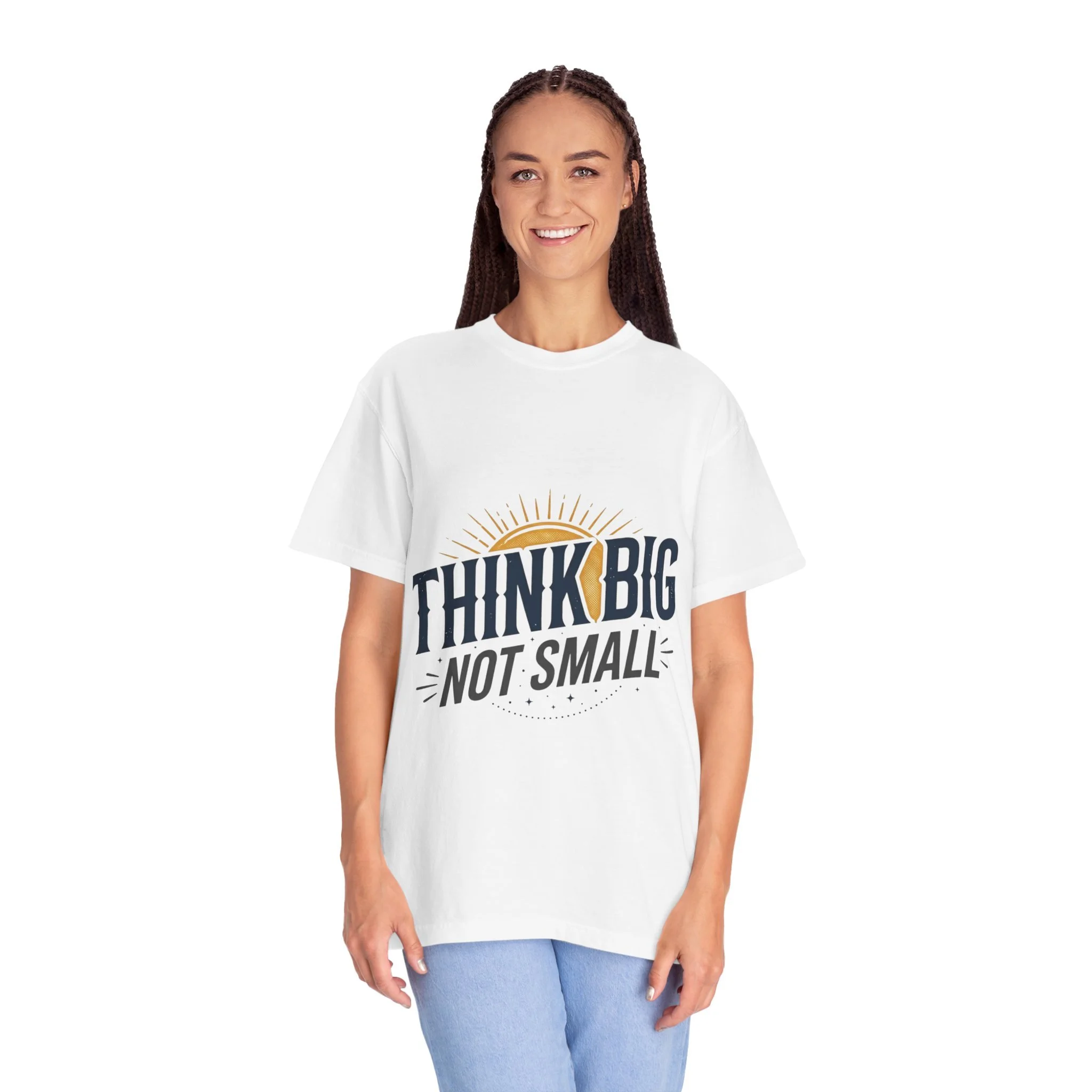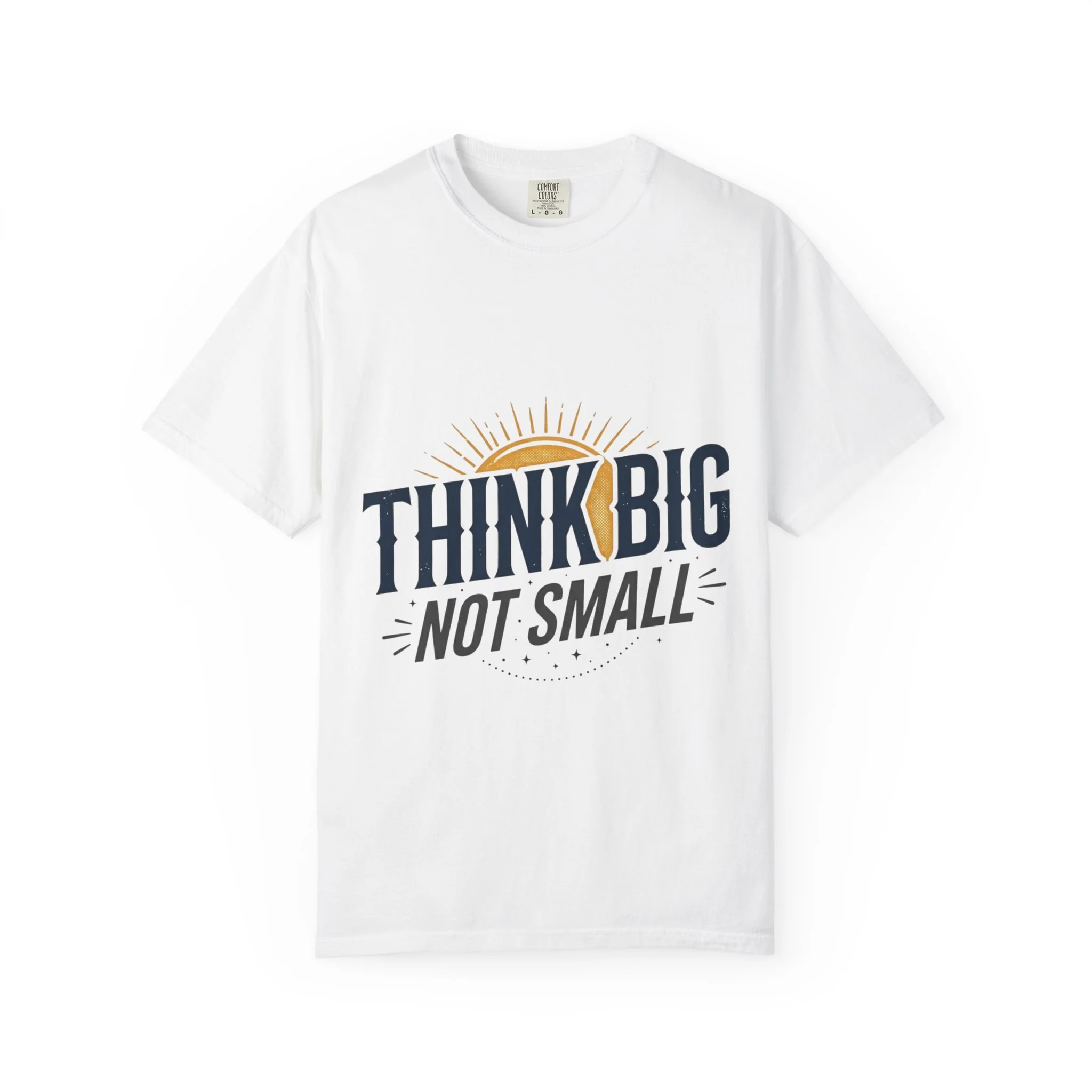 Lightweight but sturdy, this garment-dyed cotton tee carries a bold, optimistic message: THINK BIG — NOT SMALL. The vintage-inspired lettering and sunrise motif feel like a quiet nudge at dawn, the kind that pushes you toward bigger plans and braver choices. Soft, slightly broken-in color from the after-construction dyeing gives the shirt lived-in character. It sits with a relaxed fit on the body and wears well alone or layered under a jacket for early-morning coffee runs, brainstorming sessions, or neighborhood walks when you need a boost of confidence.